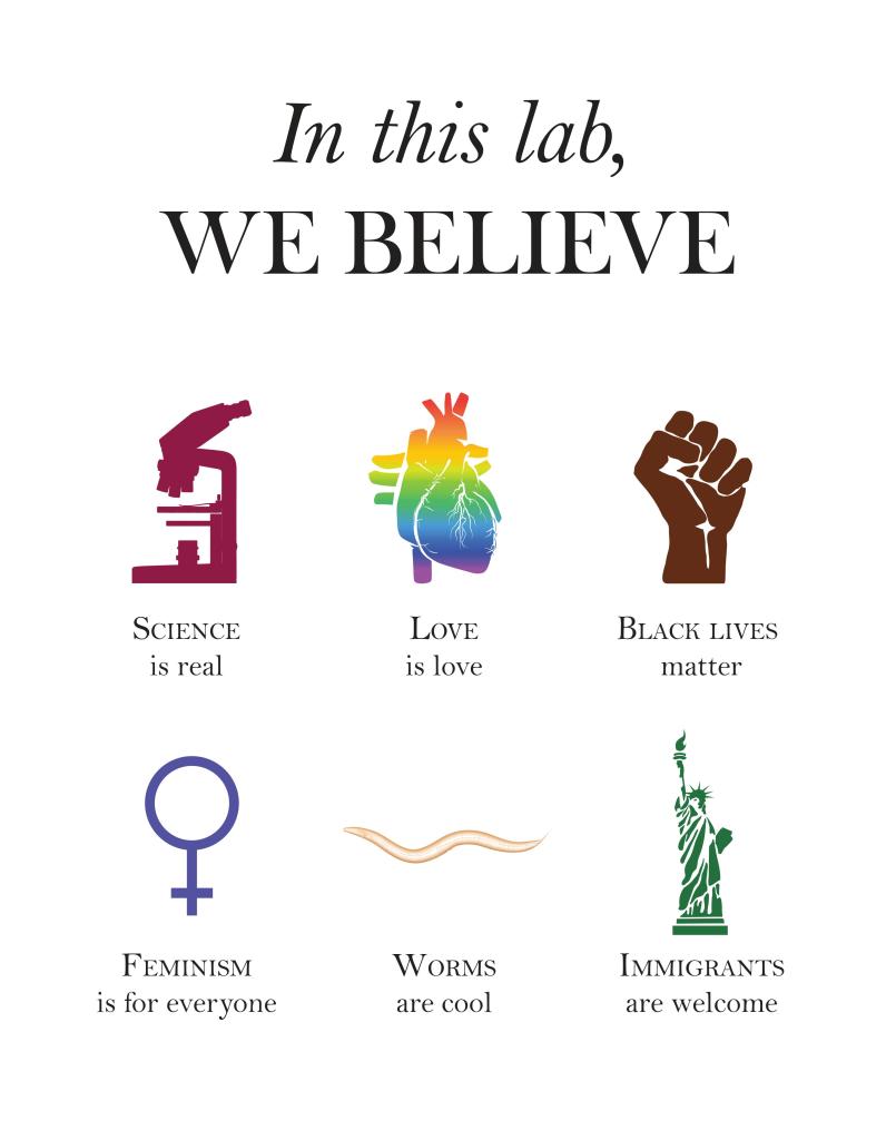 In our lab, we differ in many ways, from where we come from geographically and socioeconomically to how we live and identify. What we share is a commitment to making our communities more diverse, equitable, inclusive, and just, and to creating a space where we all feel safe, welcomed, respected, and empowered, not in spite of but because of our differences. We strive for excellence as scholars, as scientists, as teachers, and as members of our communities, which include our lab group, our department, our university, our fields of study, our scientific societies, and our city, Charlottesville, VA. We achieve excellence by including, listening to, and advocating for individuals representing a diversity of experiences.