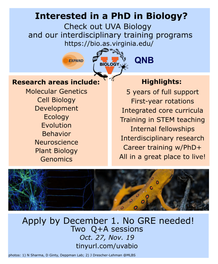 Applications for the UVA Biology graduate program are open until December 1. No GRE needed!